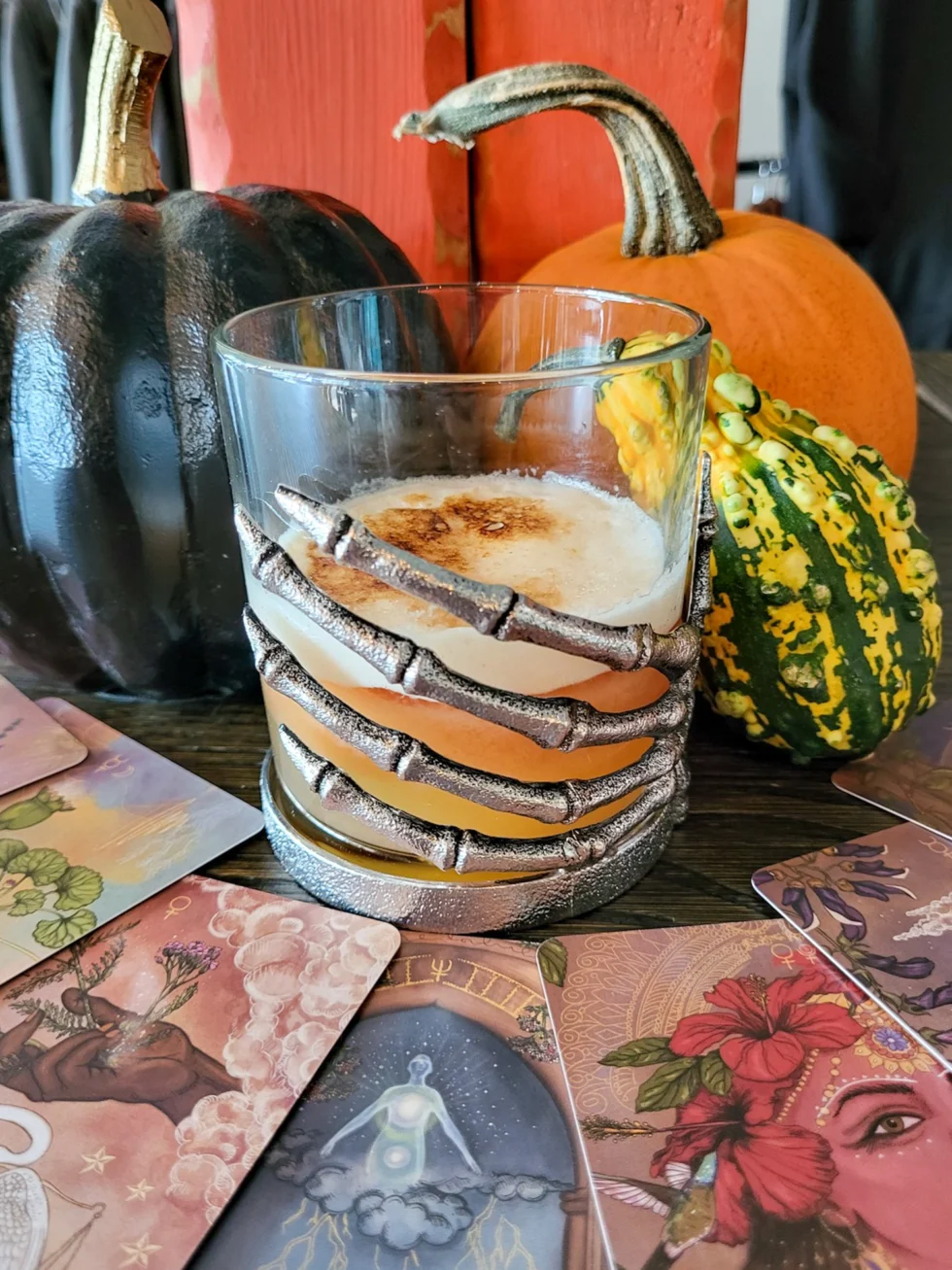 Dry shake egg whites. Then shake all other ingredients together over ice and strain. Serve in a spooky-themed glass and top with egg whites!